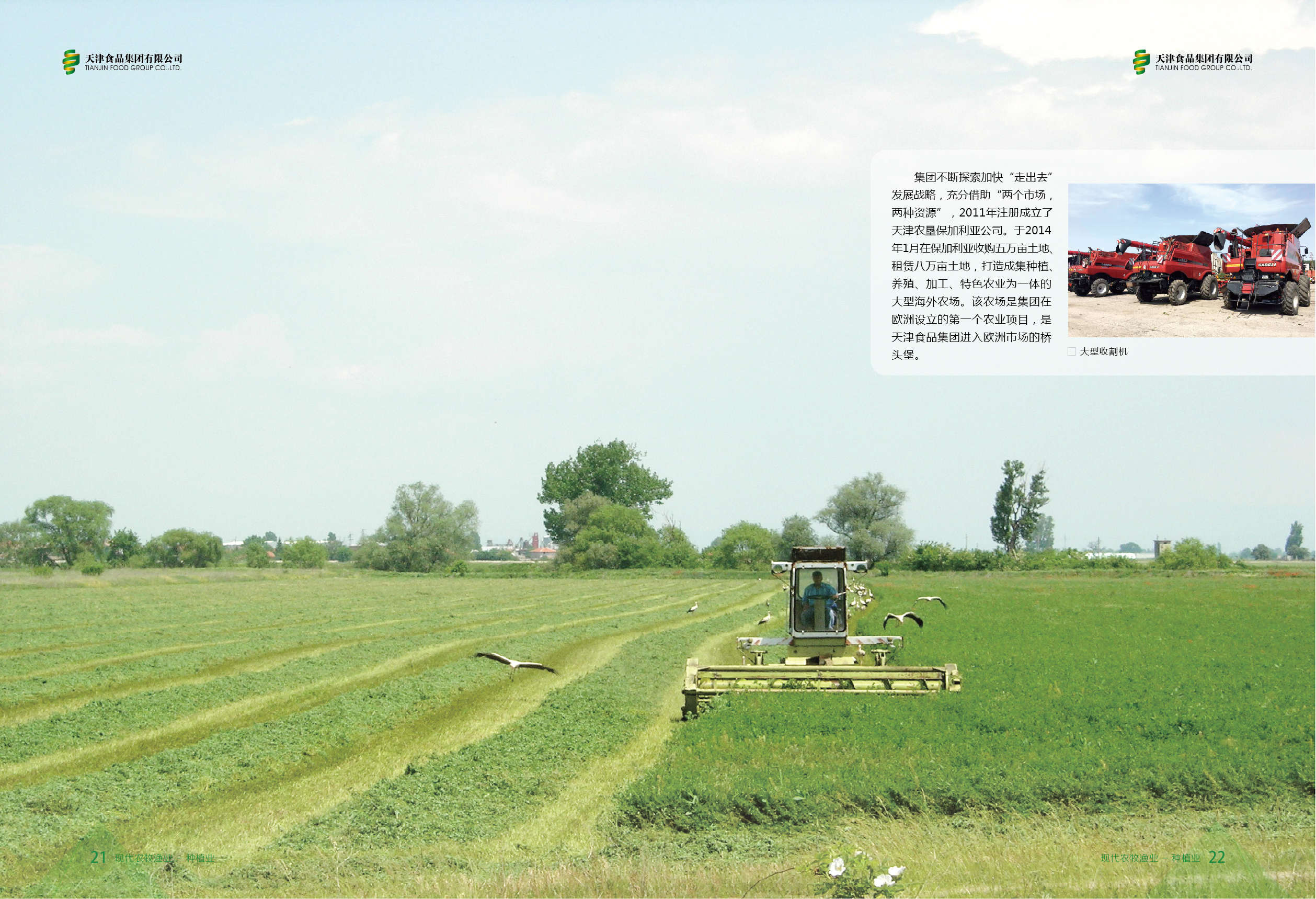 集團(tuán)不斷探索加快“走出去”發(fā)展戰(zhàn)略,充分借助“兩個(gè)市場(chǎng),兩種資源”,于2011年成立天津農(nóng)墾龍呈嘉益國(guó)際貿(mào)易有限公司,在保加利亞收購(gòu)、租賃土地,打造成集種植、養(yǎng)殖、加工、特色農(nóng)業(yè)為一體的大型海外農(nóng)場(chǎng)。該農(nóng)場(chǎng)是集團(tuán)在歐洲設(shè)立的第一個(gè)農(nóng)業(yè)項(xiàng)目,是天津食品集團(tuán)進(jìn)入歐洲市場(chǎng)的橋頭堡。The Group quickens its pace to implement the “going global” development strategy, and fully leverages the “two markets, two resources” advantage. In 2011, Tianjin Agriculture Reclamation Longcheng Jiayi International Trade Co., Ltd. was established. The company acquires and leases land in Bulgaria, and builds a large overseas farm that combines planting, breeding, processing and characteristic agriculture. The farm is the first agricultural project the Group launched in Europe, and is also the “bridgehead” for Tianjin Food Group to enter the European market.