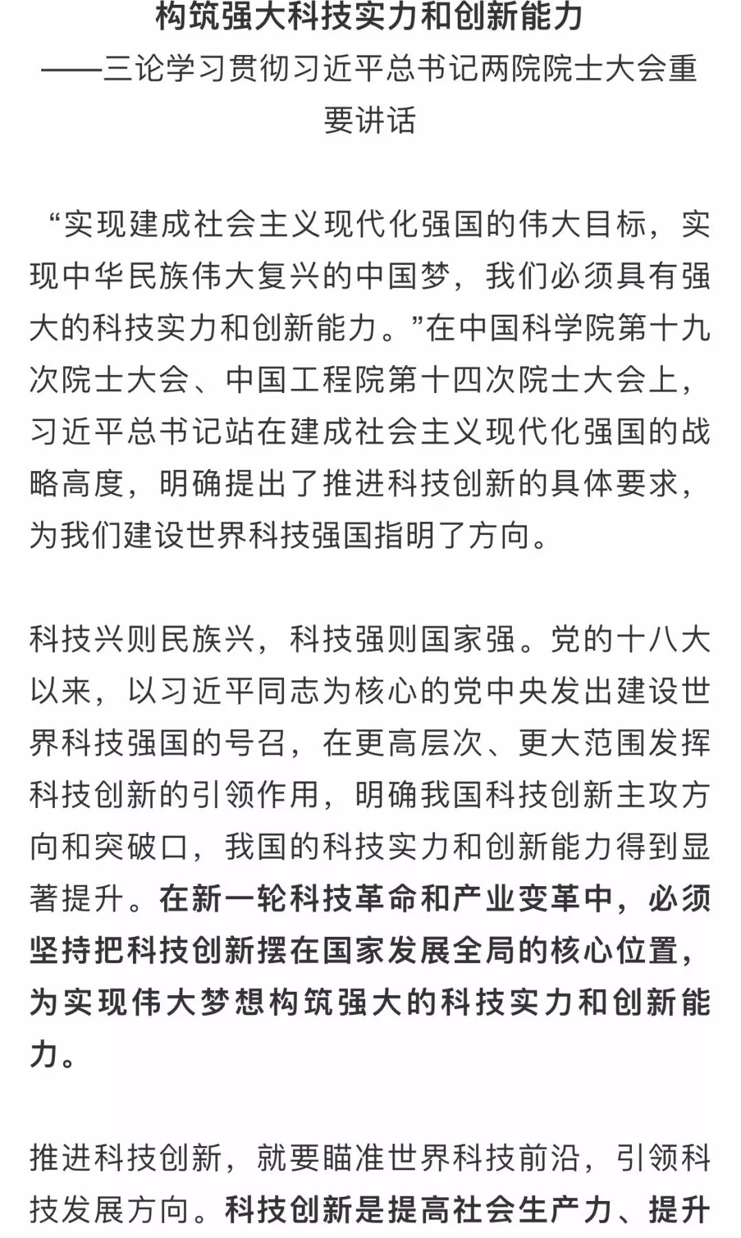 人民日報評論員:構(gòu)筑強大科技實力和創(chuàng)新能力——三論學習貫徹習近平總書記兩院院士大會重要講話