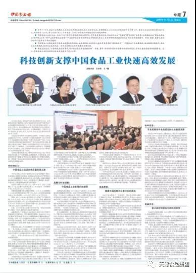 《中國食品報》昨日頭版在《秋糖會給天津食業(yè)帶來了什么?》報道中,在分析此次糖酒會給天津市帶來的影響時,對集團(tuán)在糖酒會中參與的各項工作進(jìn)行了全面介紹;第7版整版篇幅,以《科技創(chuàng)新支撐中國食品工業(yè)快速高效發(fā)展》為題,深度報道了此次由集團(tuán)和市食品工業(yè)協(xié)會主辦的“天津食品行業(yè)高質(zhì)量發(fā)展高峰論壇”的詳細(xì)情況。