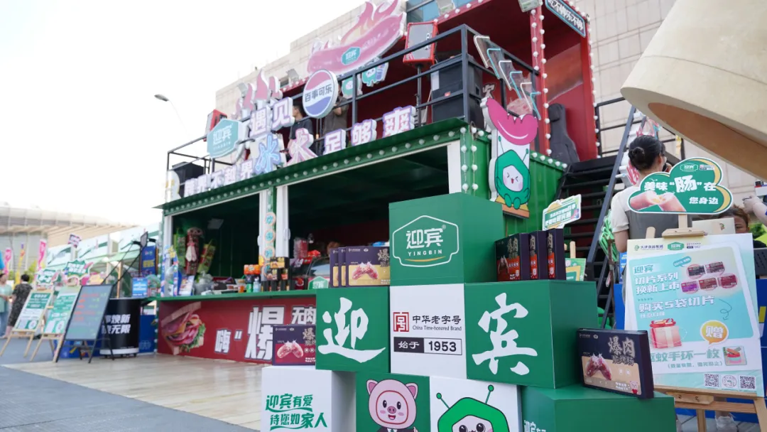 作為市集中的另一大亮點,以紅綠撞色為主體思路,采用現(xiàn)代集裝箱風(fēng)格,頂部設(shè)置“烤腸”造型,與本次市集迎賓的主打新品“爆肉脆烤腸系列”前后呼應(yīng),4種口味滿足大眾味蕾。歌手每日演出精彩不停,讓消費者在音樂中享受美食,游戲區(qū)和休閑區(qū)等多個打卡點吸引消費者眼球。此外,迎賓與百事攜手聯(lián)名打造了跨界不越界的冰火效果,提高了迎賓的品牌知名度,迎賓與百事將以此為契機,穩(wěn)步推進深度合作。