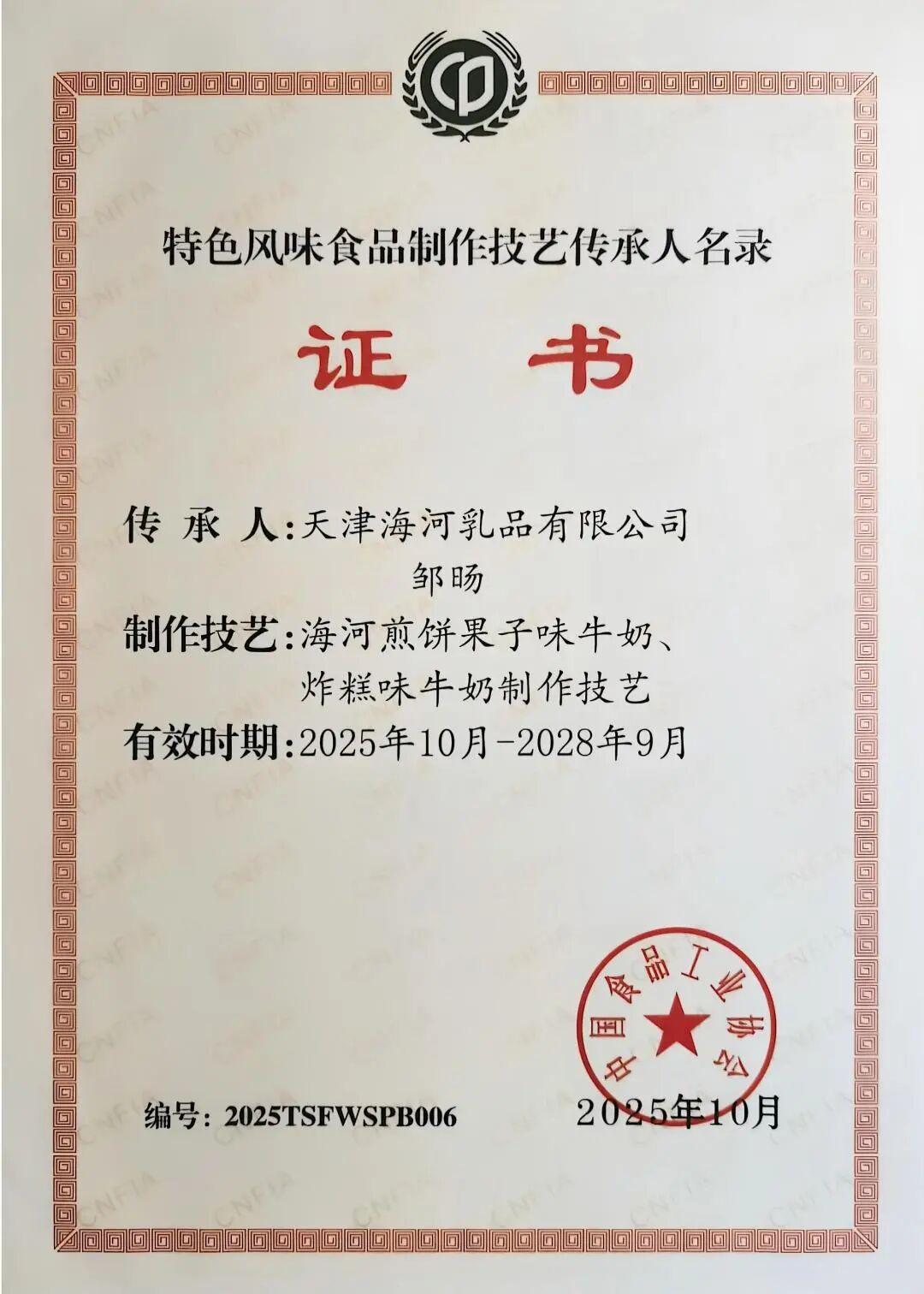 近日,中國(guó)食品工業(yè)協(xié)會(huì)公布第二批“特色風(fēng)味食品標(biāo)志性產(chǎn)品、制作技藝傳承人名錄”。海河乳品公司黨委書記、董事長(zhǎng)鄒旸榮獲“特色風(fēng)味食品制作技藝傳承人”稱號(hào)。煎餅果子味牛奶、炸糕味牛奶榮膺“特色風(fēng)味食品標(biāo)志性產(chǎn)品”。這一由國(guó)家行業(yè)權(quán)威組織、經(jīng)專家多輪評(píng)審認(rèn)定的成果,標(biāo)志著海河乳品公司在傳承與創(chuàng)新地域特色食品、推動(dòng)傳統(tǒng)風(fēng)味現(xiàn)代化轉(zhuǎn)型方面走在了行業(yè)前列,為老字號(hào)品牌注入了強(qiáng)勁動(dòng)能。